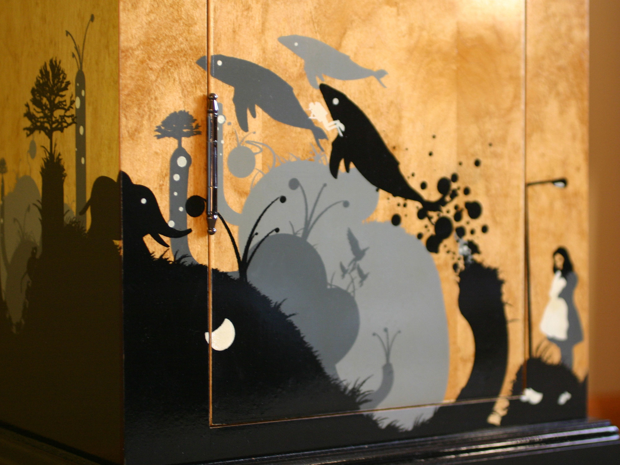 We constructed this tall dresser out of maple. The cabinet features a 4 color design that flows along 3 sides of the piece as well as impressions on the inner door and top.
